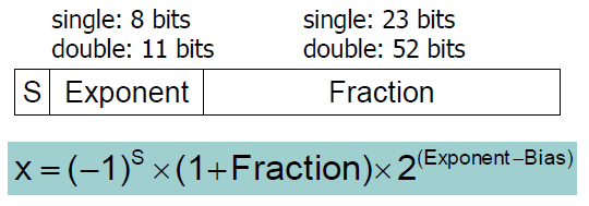 - Normalized Notation in Binary : \(±1.xxxx * 2^{yyyy}\) (이진수 정규화 표기에서 정수부는 항상 1임에 유념하자.)