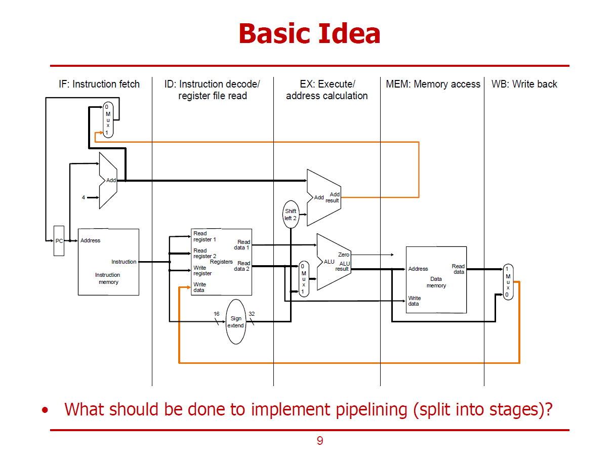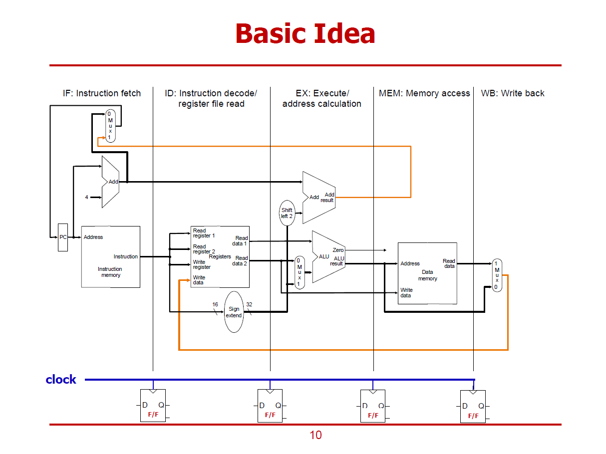 - 주황색 Data Path : 역방향으로 진행되는 Data Path이다. (현재 명령어를 위한 값이 아닌, 다음 명령어를 위해 이용되는 값이다. 즉, 몇 Stage 이후에 반영되는 값들이다. 이전 Stage에 반영되는 것이 아니다.)