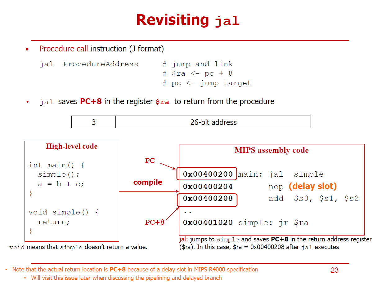 - 단, Delayed Branch 기법을 사용하는 MIPS R4000 SPEC의 프로세서는 ra 레지스터에 PC+4 대신, PC+8을 저장한다.