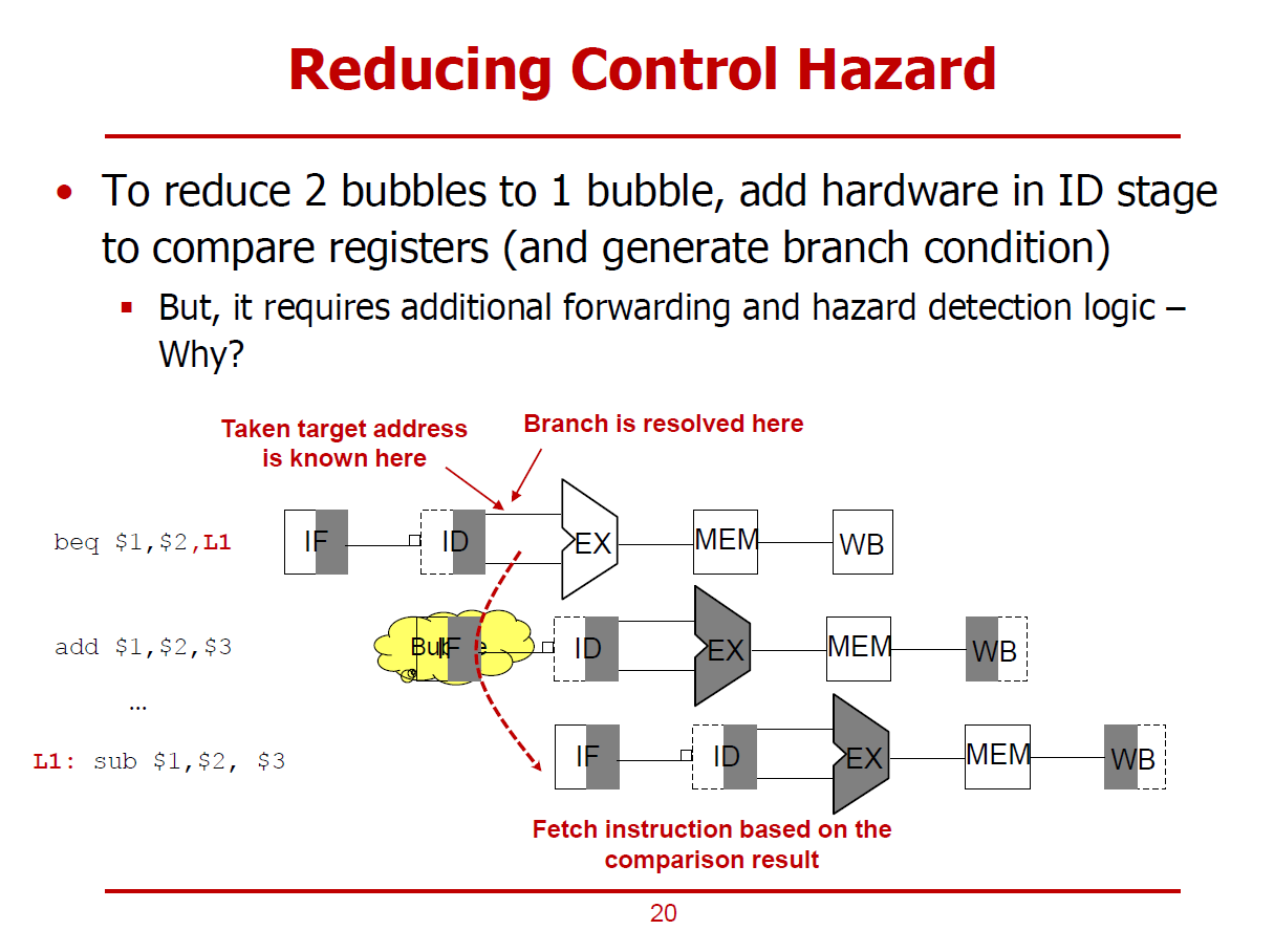 - ID Stage에서 두 개의 레지스터 값을 비교하여 분기 여부와 분기 주소까지 계산하는 H/W를 추가하는 방법이다.