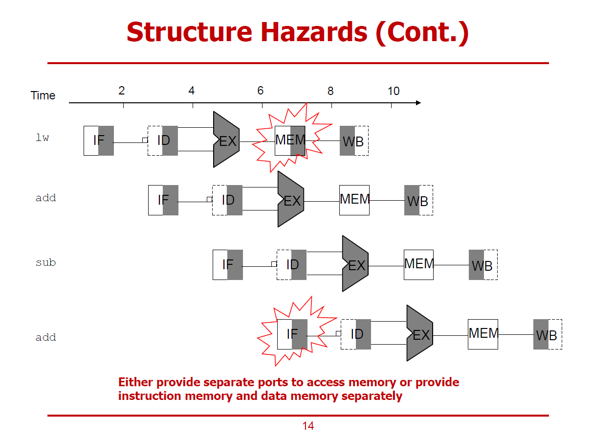 - 위와 같은 가정하에서, 6ns - 8ns 구간에서 lw명령어의 MEM Stage에서도 메모리를 사용해야 하고, add명령어의 IF Stage에서도 메모리를 사용해야 한다.