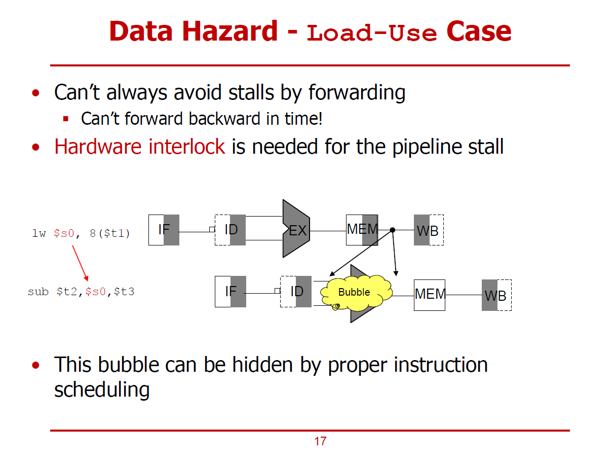 - sub 명령어에서는 EX Stage에 $s0의 데이터를 필요로 하기 때문에 lw 명령어의 MEM Stage에서 포워딩을 수행해도 1 Cycle만큼의 Bubble이 불가피하게 사용된다.