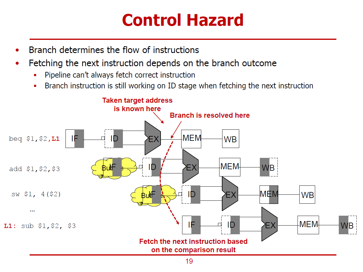- 컨트롤 해저드는 Branch 명령어에서 분기 조건이 계산되기 전까지는, 다음 명령어의 Next Fetch를 수행할 수 없게 되는 상황을 의미하는 해저드이다. (즉, 분기 명령어의 ID Stage를 진행할 때, 다음 명령어의 IF Stage가 진행되어야 하는데, 분기 명령어의 EX Stage 이후에 다음 명령어의 IF Stage를 진행할 수 밖에 없는 상황이다.)