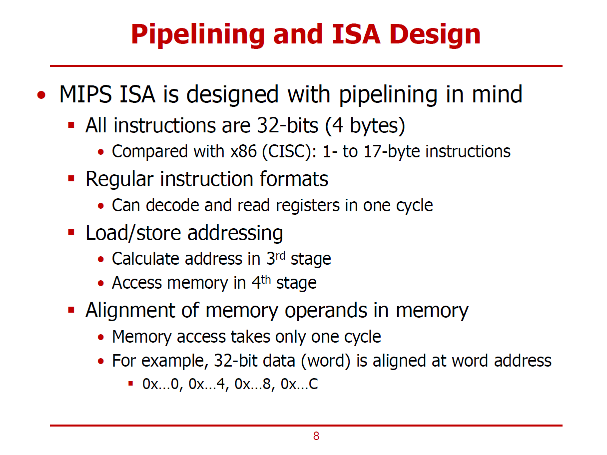 - MIPS의 ISA 구조는 Pipeline을 적용하기에 유리한 구조이다.