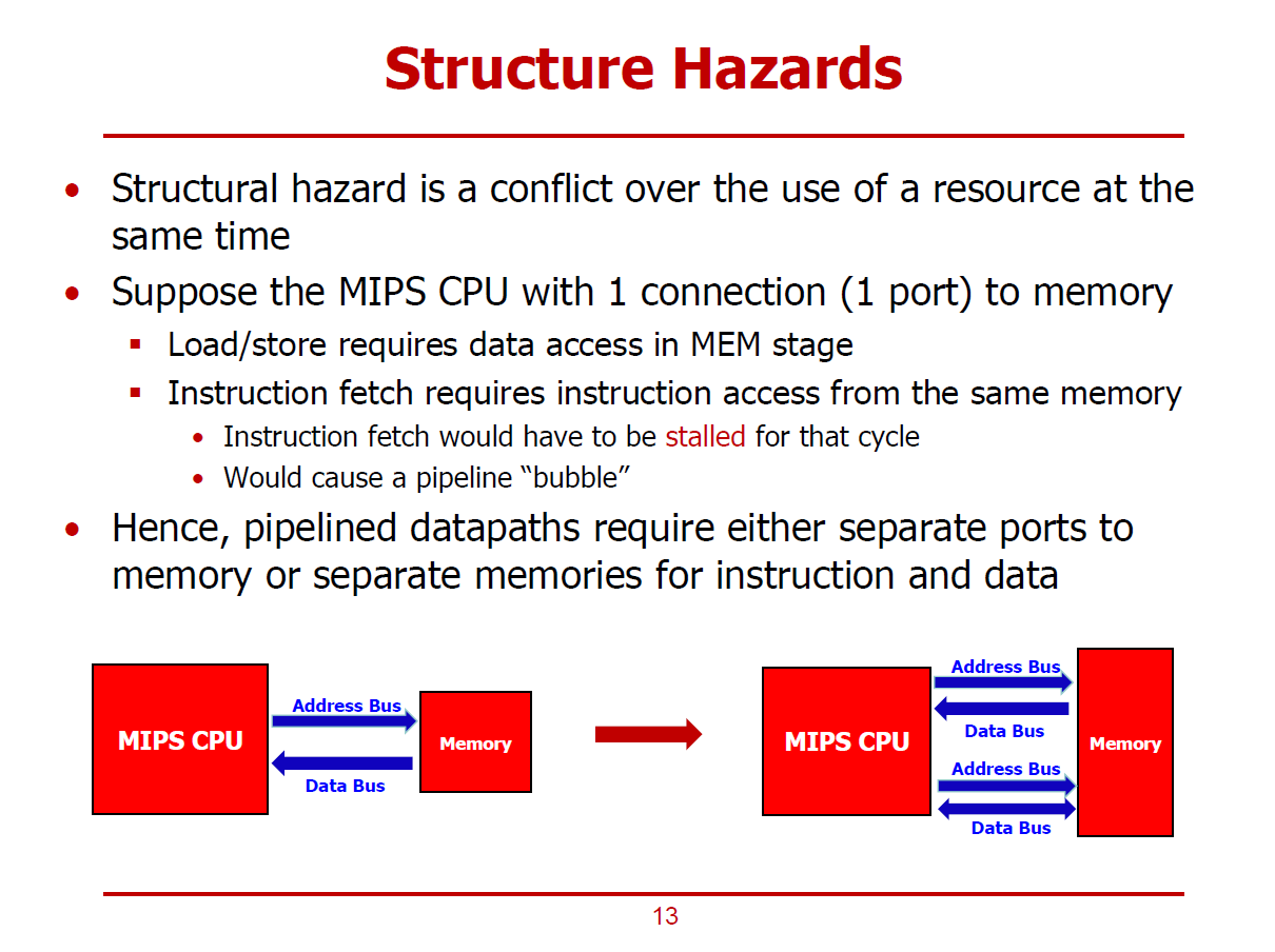 - H/W 자원을 여러 명령어에서 동시에 요구할 때 발생하는 Conflict(=Hazard)이다.