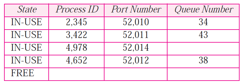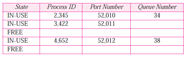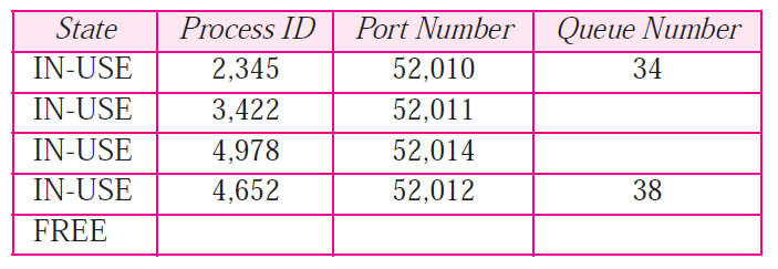 - 첫 번째 엔트리는 2,345의 P-ID에 해당되는 프로세스가 34번 Incomming Queue에 연결된 52,010 포트에 바인딩되어 사용중에 있음을 의미한다.