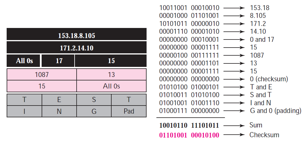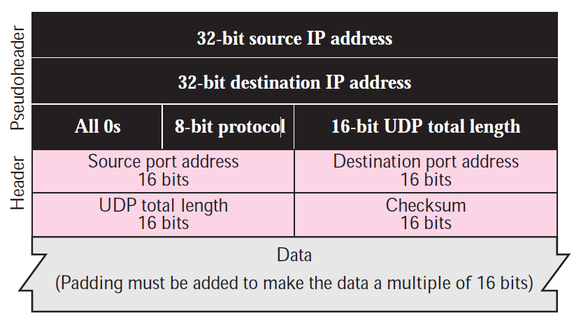 - 일반적으로, Checksum은 위와 같은 UDP 패킷의 경우, Data가 16bits의 배수가 되도록 Padding을 삽입하고, Padding이 삽입된 Data의 길이를 저장한다.