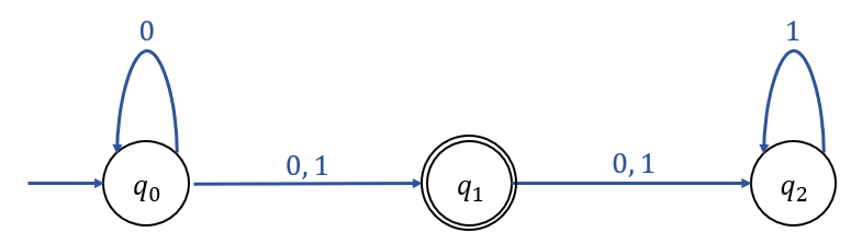 \(\delta(q_0, 0) = q_0, \qquad \delta(q_0, 1) = q_1, \\