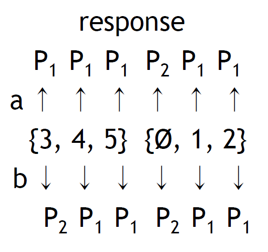 Step 2. 모든 State에 대해, Symbol에 대한 전이가 집합 \(P_1\)으로 향하는지, 집합 \(P_2\)로 향하는지를 조사한다. (Response)