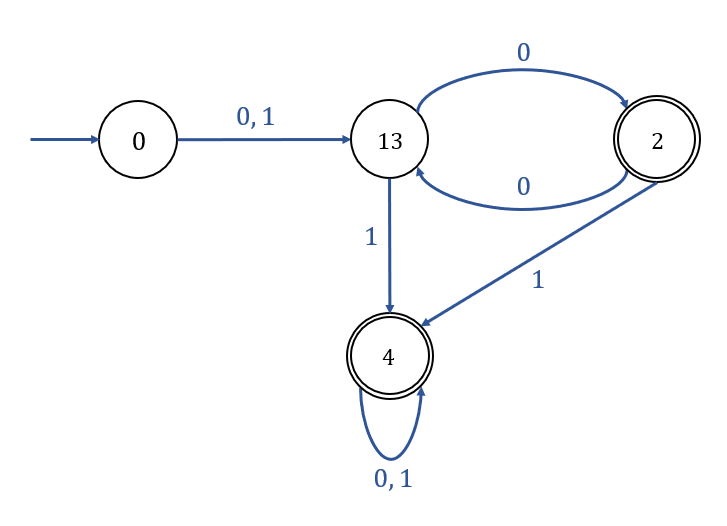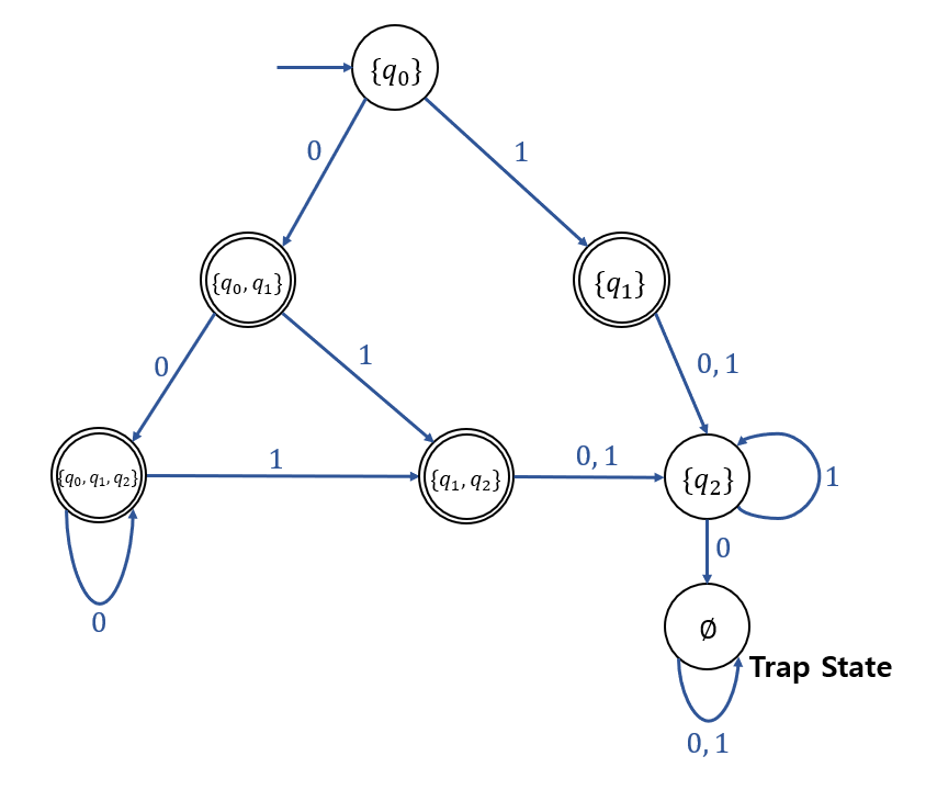 Step 4. Initial State \(\widehat{q_0}\)은 \(\widehat{M}\)의 State들 중 라벨이 0을 포함하는 State이다.