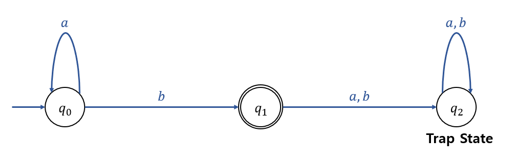 언어 \(L = \{a^{n}b : n \geq 0\}\) 일 때, 전이 그래프는 아래와 같다.
