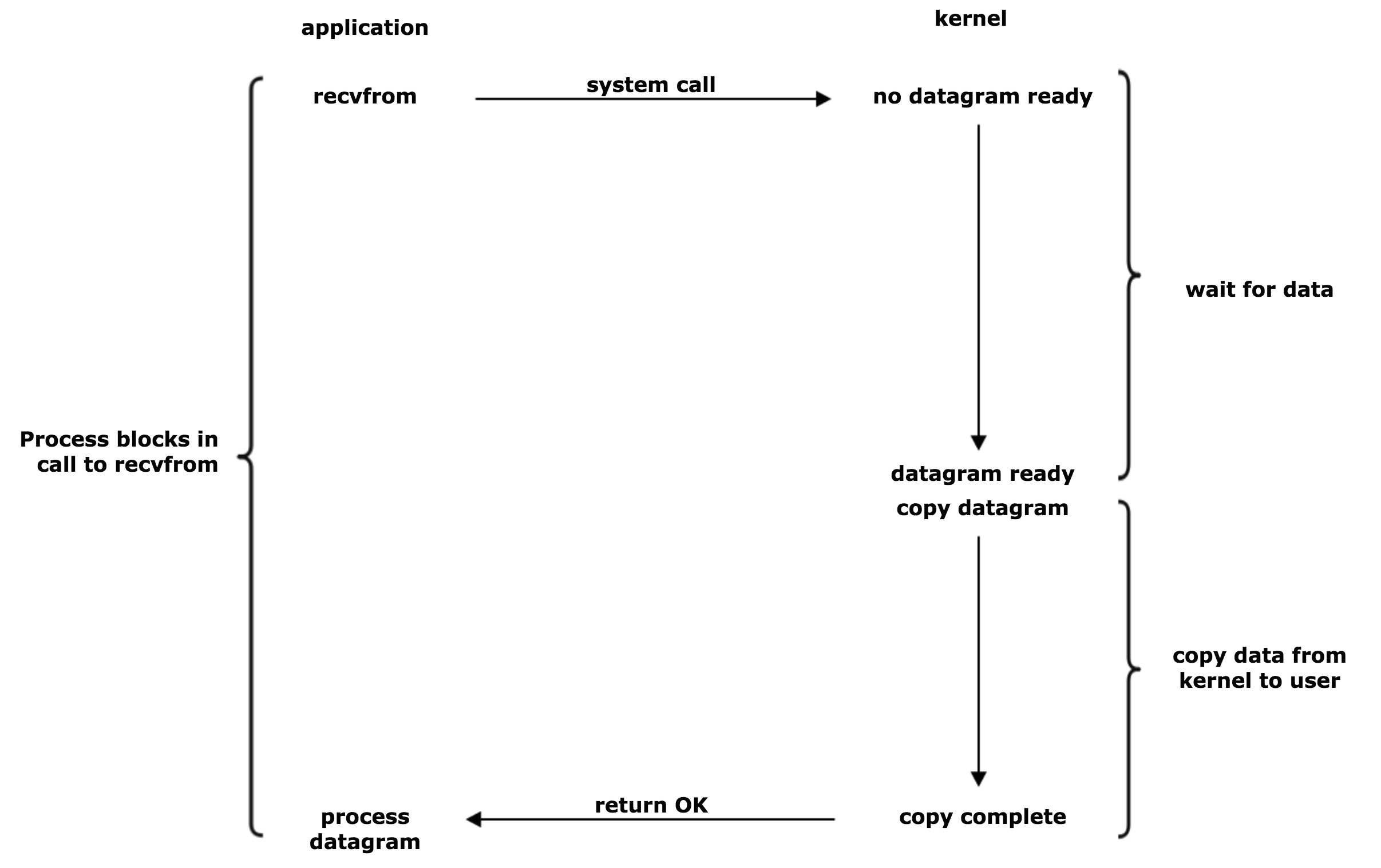 - Application(User Process)에서는 recvfrom()을 통해, Kernel에 도착한 Datagram을 Application의 Buffer에 복사한다.