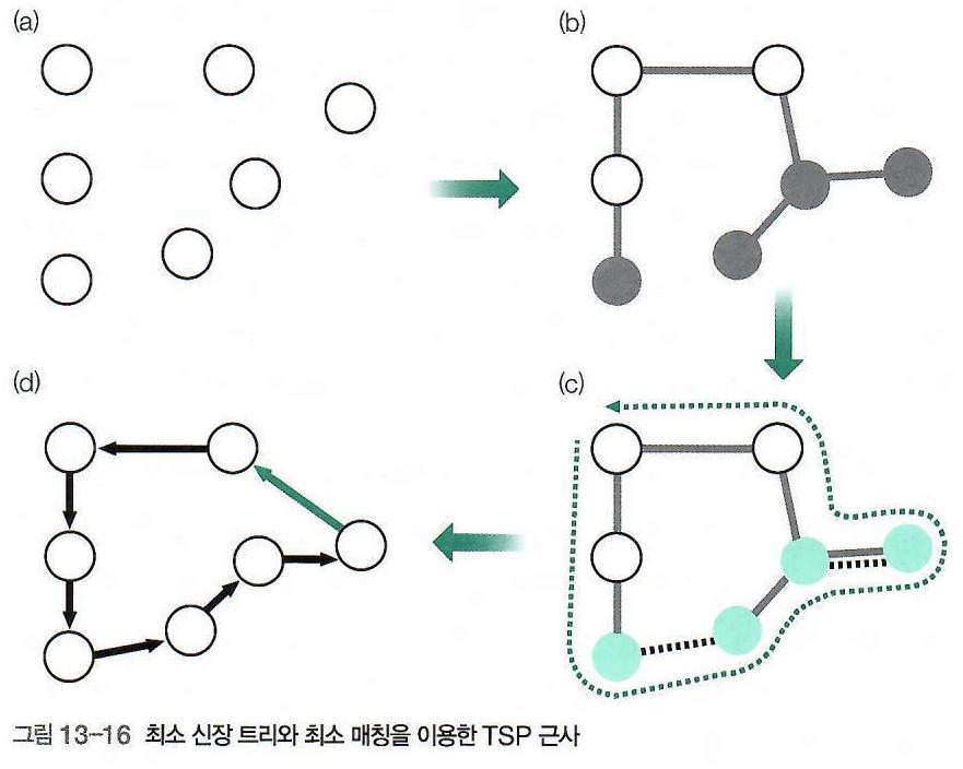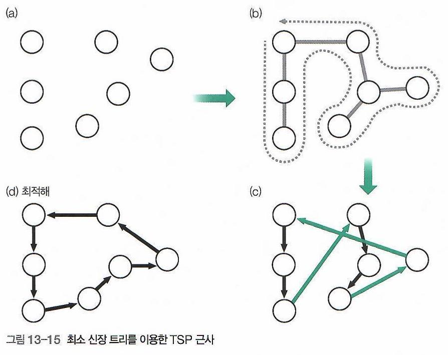 pf) (최소 신장 트리의 간선의 가중치의 합) < (TSP의 최적해의 사이클 길이) 이다.