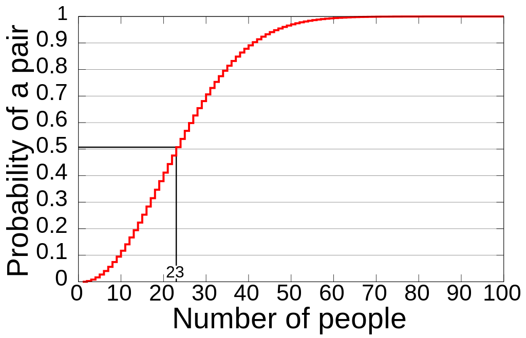 23명의 사람만 모여도 생일이 같은 한 쌍이 나올 확률이 50%가 넘어가며,