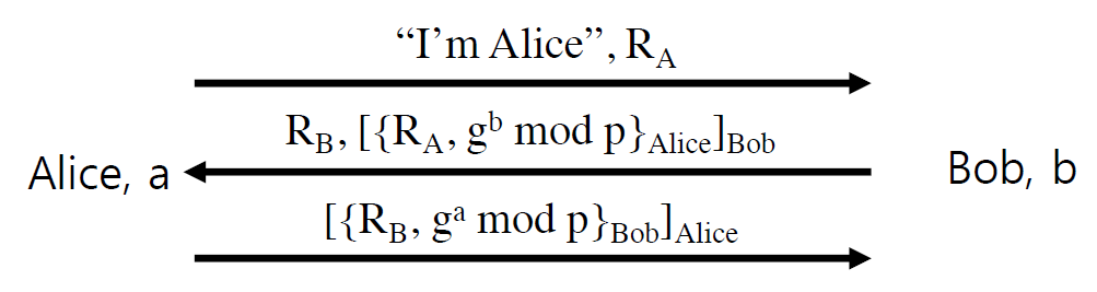 - Alice와 Bob은 세션 키 \(K = g^{ab} \; \mathrm{mod} \; p\)를 합성한 후,