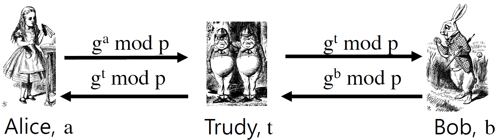 - 디피-헬만 알고리즘은 중간자 공격에 취약하다.