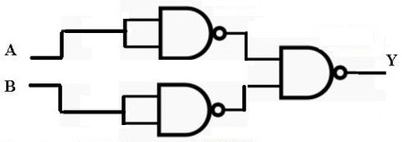 Y = ((AA)'(BB)')' = ((A'+A')(B'+B'))' = (A'B')' = A + B