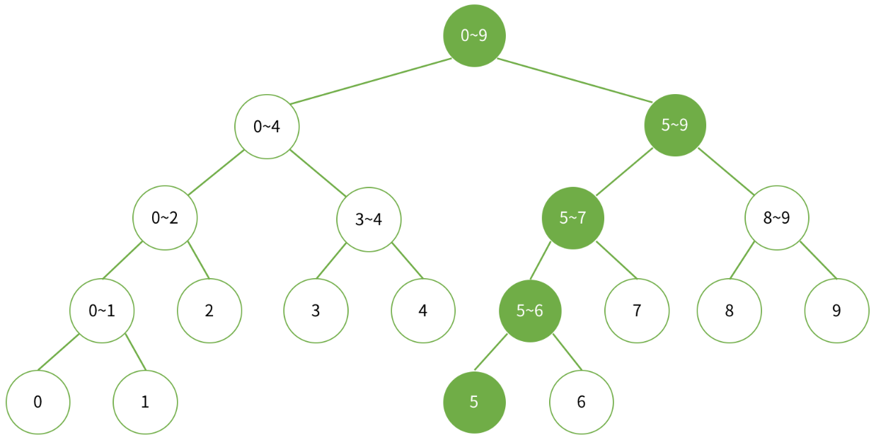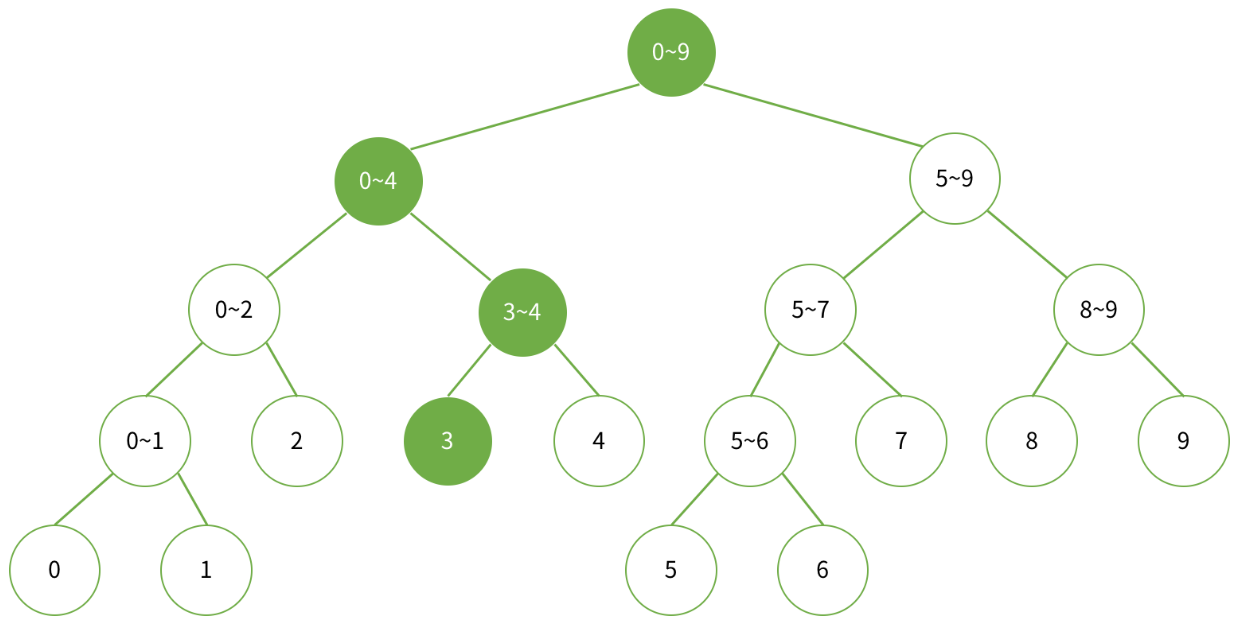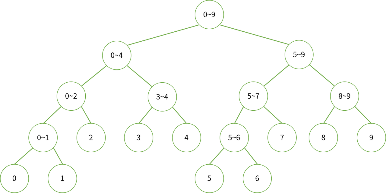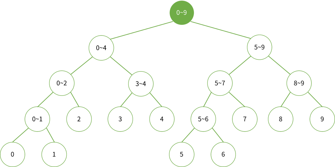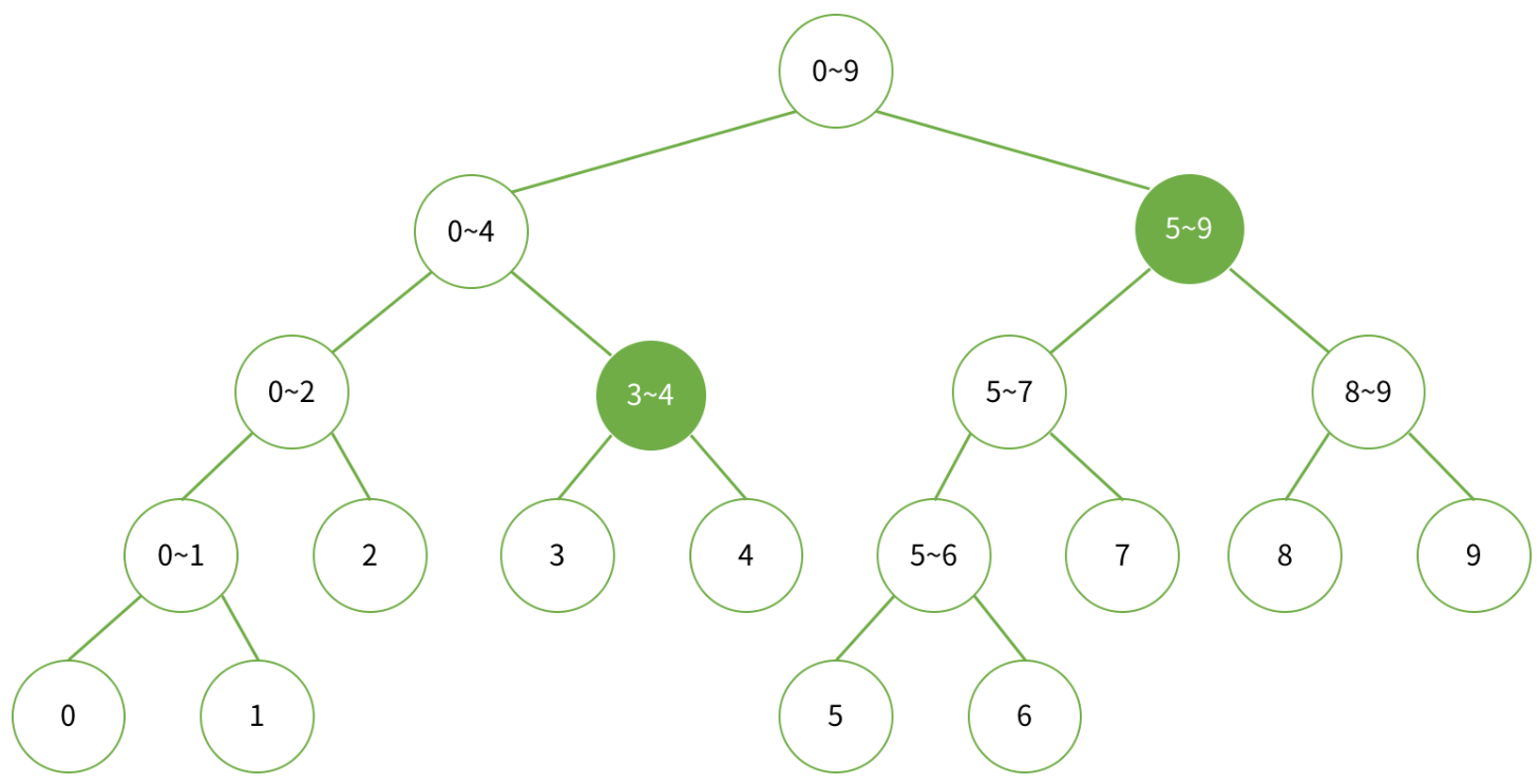 Example. 데이터가 배열 a[0...9]에 저장되어 있는 경우, 세그먼트 트리의 구성과 부분합을 구할 때 사용되는 노드